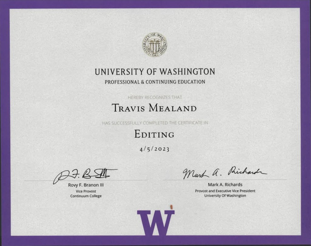 Travis Mealand is a freelance editor and a graduate of the Editing Certificate program with the University of Washington. Born and raised in Seattle, Washington, Travis received his bachelor’s degree from Western Washington University in 2014, completing a double major in English: Creative Writing Emphasis; and Spanish: Language & Literature.